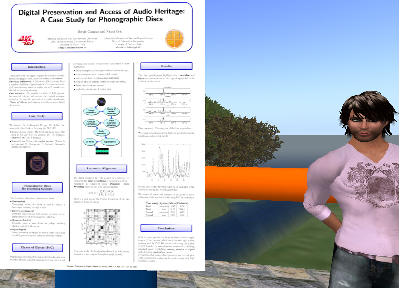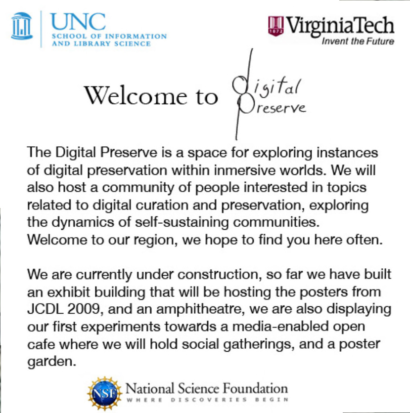 El lunes 28 de septiembre de 2009 mientras visitaba mi espacio virtual en Second Life, recibí una invitación para asistir a una exhibición. Dicha exhibición se trataba de un “poster section” que presentan profesores y estudiantes candidatos a PHD. Acepté la invitación y me tele transporté al área de la exhibición auspiciada por: University of North Carolina at Chapel Hill y Virginia Tech. La exhibición está basada en la preservación digital, se pretende estudiar las formas de preservación en mundos virtuales. A la llegada me recibe mantruc Martian quien gentilmente me explico el proyecto y me llevo a ver las facilidades y la exhibición. Agradezco también a EdFox Reiko quien gentilmente me oriento también durante la visita. Les exhorto a visitar el área y ver como estos estudiantes y profesores coordinan un evento de suma importancia utilizando la plataforma de Second Life. La dirección para llegar a la isla llamada Digital Preserve es: http://slurl.com/secondlife/Digital%20Preserve/140/126/29