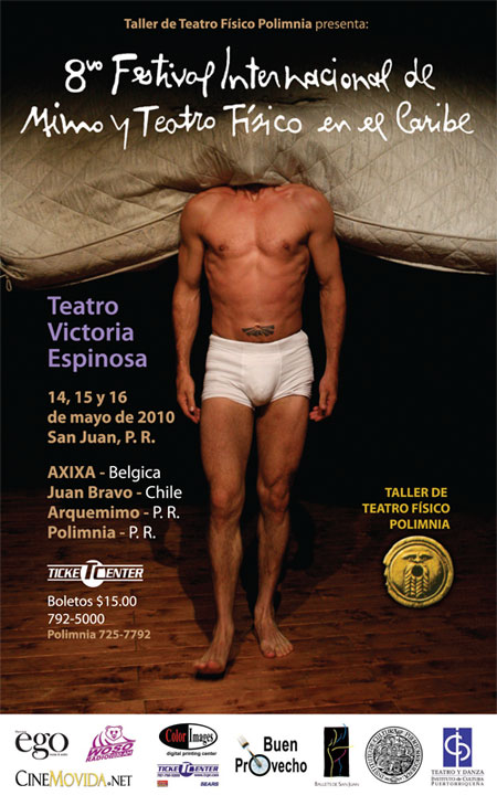 Durante la semana estaremos ofreciendo dos talleres de mimo corporal por la compañía AXIXA de Bélgica para maestros y público general, el martes 11 y el miércoles 12 a la 6:00pm en las facilidades de Ballets de San Juan en la Ave. Ponce de León. El lunes 10 Juan Bravo de Chile ofrecerá una conferencia ilustrada sobre el arte del mimo en Chile. Funciones, viernes 14 y sábado 15 a las 8:30pm y el domingo 16 a las 4:00pm en el Teatro Victoria Espinosa. La entrada general es de $15.00. Para compra de boletos Ticket Center, 787-792-5000, para información sobre la conferencia ilustrada y los talleres, comunicarse con el Taller de Teatro Físico Polimnia al 787-725-7792.