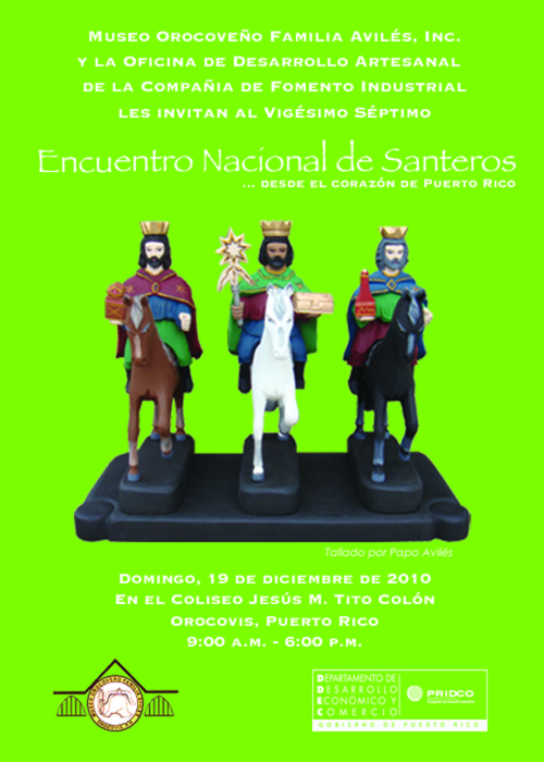 Le invitamos a que nos acompañe en la apertura de la exposición dedicada a la talla de santos: Epifanía Borincana. La actividad de apertura será el domingo, 5 de diciembre de 2010 (1:00 pm), pero la exposición se extenderá hasta el 27 de marzo de 2011. Esta exposición está compuesta por más de 80 tallas dedicadas a los Reyes Magos. Durante la tarde de apertura se ofrecerán talleres de arte para niños, tendremos música en vivo y demostración de talla de santos, entre otras sorpresas. No dejes que te lo cuenten, ¡acompáñanos!