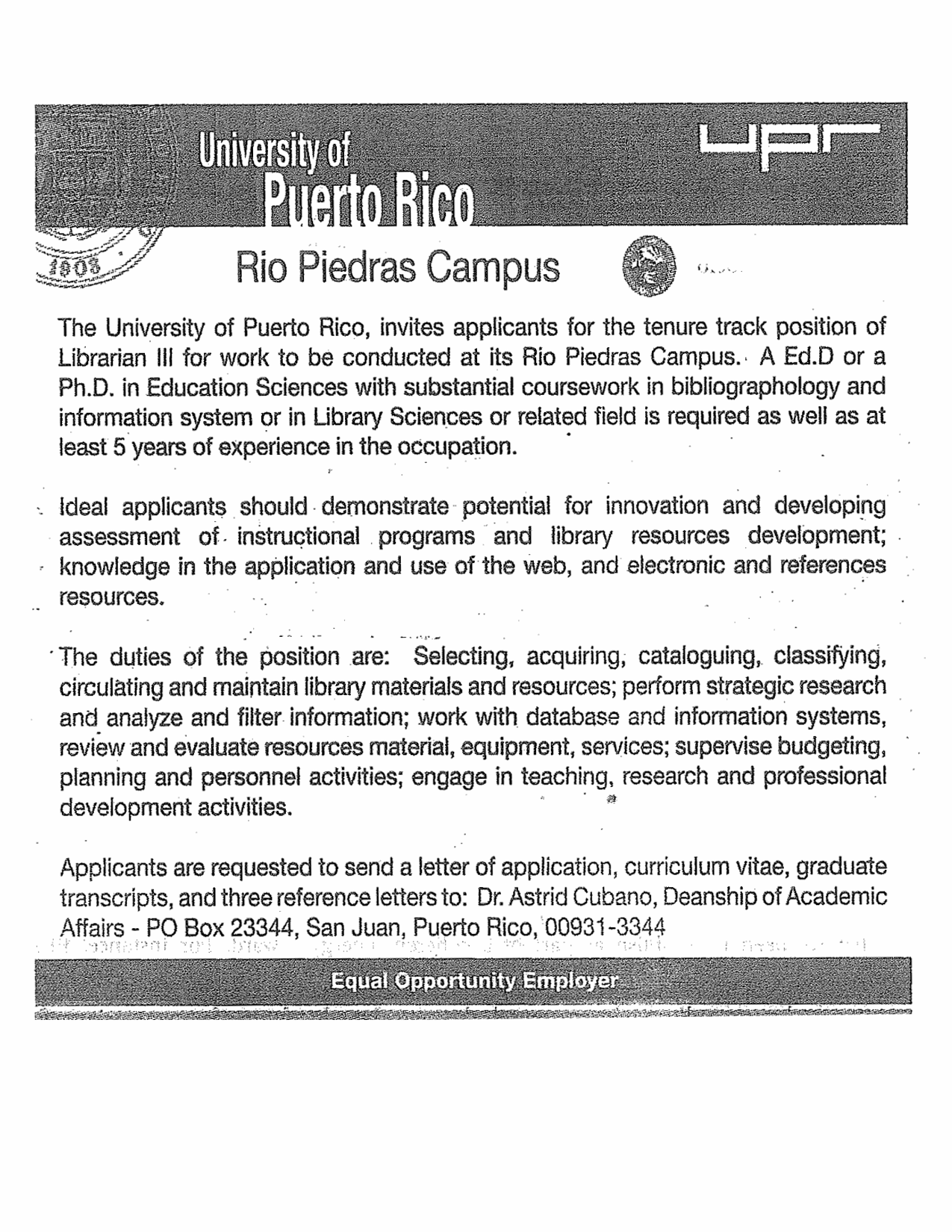 Saludos a todos, sobre todo a mis compañeros del Sistema Universitario de la UPR. Anda rondando una convocatoria por ahí que según los rumores tiene su nombre. Se las incluyo para que la evalúen y vean si va acorde con las estipulaciones de ALA. Exigen doctorado que ni para el Director del Sistema de Biblioteca, ups. He participado en el comité la selección del Director del Sistema y siempre se redacta como el preferiblemente doctorado o en su lugar maestría o lo que se requiera. ya sabemos que la plaza es para alguien que ya tiene el doctorado y que hace x tareas con 5 años de experiencia en el área, ups, creo que se ve el nombreeeeeeeeeeee, yo no he dicho ninguno, no sean mal pensados. Bueno también se que somos muchos los que estamos en el sistema de bibliotecas sin plaza, con maestría, certificados post maestrías y doctorados. Y sobre todo con muchísimos años de experiencia, totalmente nativos que debemos tener prioridad según estipulan las leyes. Ojo, a los Comités de Personal, no se presten para el jueguito, al fin y al cabo son los docentes los perjudicados con estos nombramientos. Es necesario que todos hagamos algún pronunciamiento a esto y que no dejemos que personas que desconocen el Sistema, que no tienen idea de las prioridades de nuestro Sistema, tomen decisiones equivocadas. Ahí les dejo la convocatoria para que la evalúen y tomen sus propias conclusiones.