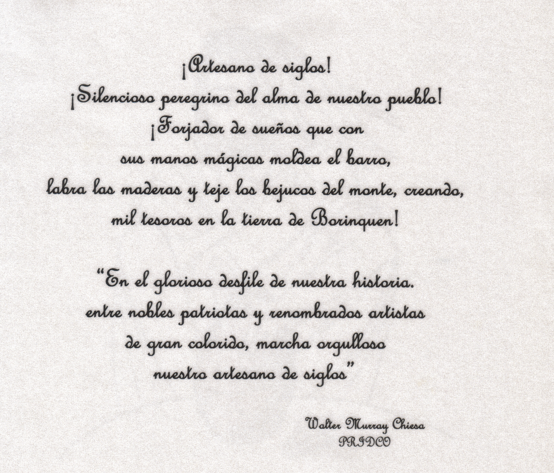 Papiro Digit@l se enorgullece en felicitar a todos los artesanos durante el mes de Julio, proclamado como mes del artesano puertorriqueño. Muchas gracias por deleitarnos durante todo el ano con su talento y por mantener vivas nuestras costumbres, nuestras tradiciones y nuestro folclor. Mucho éxito y continuemos manteniendo viva NUESTRA CULTURA. Los dejo con un dibujo de Hector Rincon de un ALFAREFO, imagen que habla por si sola y para acompañar esta imagen que mejor que un poema de Don Walter Murray Chiesa dedicado a ustedes NUESTROS ARTESANOS. ¡Muchas Felicidades!