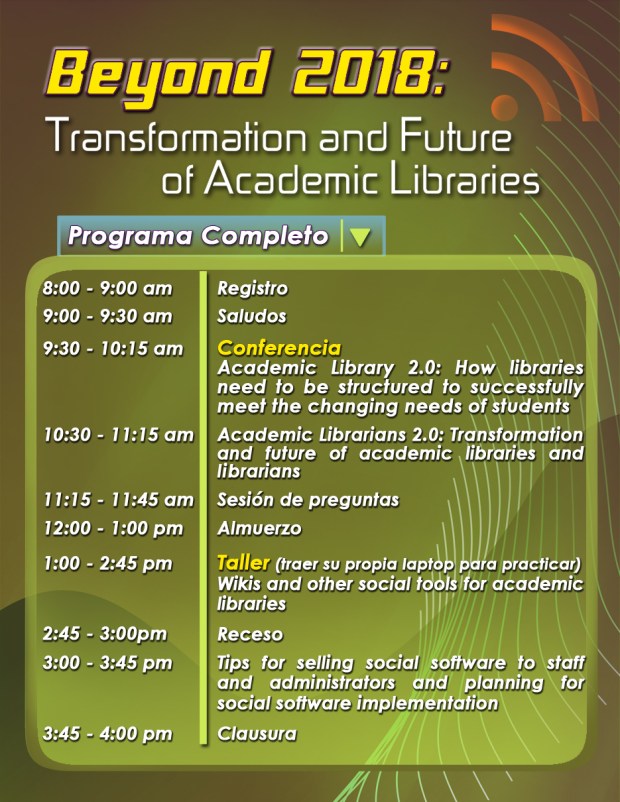 La autora del libro Social Software in Libraries, Merredith Farkas estara en Puerto Rico el proximo 30 de mayo. Un gran evento que los bibliotecarios y profesionales de la informacion no debemos dejar pasar por alto. La Web 2.0 y sus aplicaciones vinieron para quedarse, como profesionales tenemos una labor social que ejercer y que mejor que la Web 2.0 para lograr este objetivo. Les incluyo el programa y la direccion para registrarse que proporcionara la Universidad de Puerto Rico en Mayaguez, quienes auspician el evento.