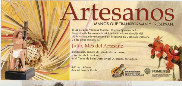 JULIO MES DEL ARTRESANO, MAÑANA MIÉRCOLES 1 DE JULIO DE 2009 A LAS 10 DE LA MAÑANA TODOS LOS CAMINOS CONDUCEN AL CENTRO DE BELLAS ARTES DE CAGUAS PARA CELEBRAR EL 32 ANIVERSARIO DEL PROGRAMA DE DESARROLLO ARTESANAL CON LOS ACTOS OFICIALES POR LA COMPAÑIA DE FOMENTO INDUSTRIAL. DEDICADA A VARIOS COMPAÑEROS ARTESANOS Y AL RESTO DE ARTESANO DE NUESTRO PUEBLO. (Publicado por Legna Leafar Zetineb Sotam’s Photos y Artesanias Laureano en Facebook)